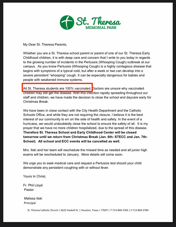 The letter actually says, “All St. Theresa students are 100% vaccinated. Doctors are unsure why vaccinated children may still get the disease.”
